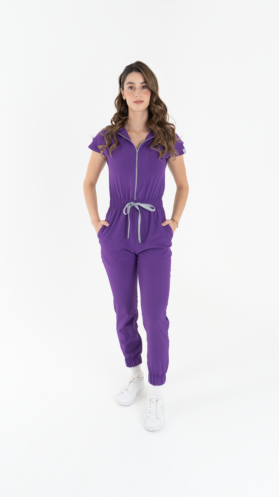 Nuestro jumpsuit tiene un cuello alto, cierre frontal, una bolsa en el pecho y dos bolsas en el pantalón, resorte en cintura y tobillos.